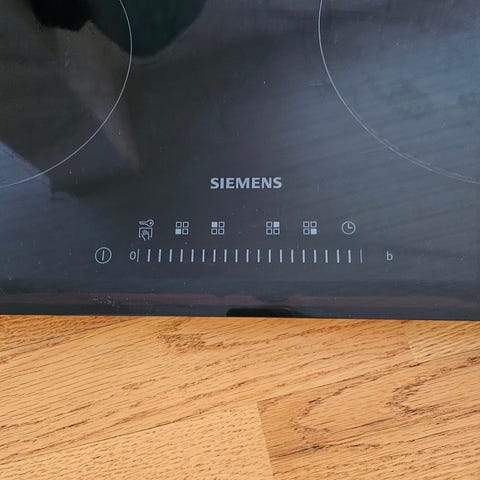 Induksjonstoppen er i meget god stand og fungerer optimalt, men det er et lite - og ubetydelig - hakk i ytterkant på platen, til høyre for Siemens logo, som kan antydes på bildet.
