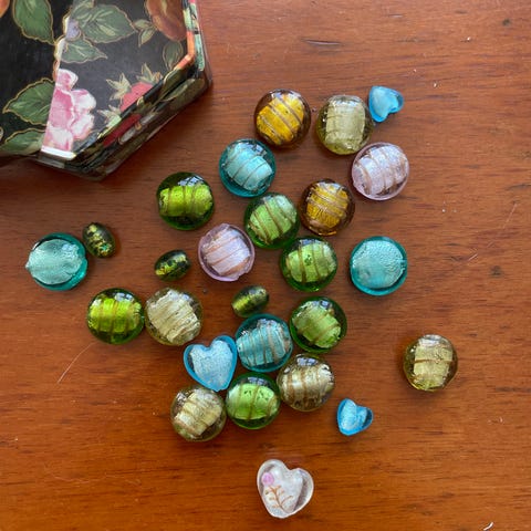 Vakre, tsjekkiske glassperler i grønn farge med dekorative mønstre. Passer til smykkelaging og dekorative formål.