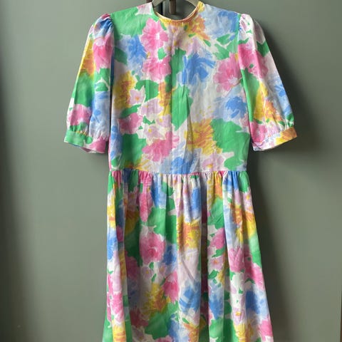 Brunt stoff med hvite blomster, ermer og krage. Det feminine designet gir et friskt og sommerlig preg. Utrolig deilig materiale.