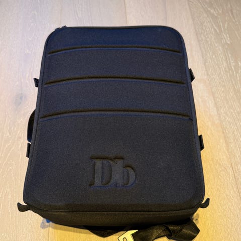 Db Kamera ryggsekk i blå farge. Ryggsekken har flere rom og lommer for oppbevaring av kamerautstyr og tilbehør. Den er designet for å beskytte og organisere kamera, objektiver og annet utstyr.
