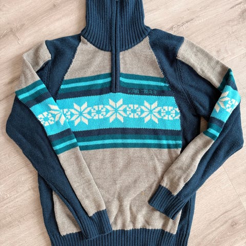 Kari Traa høyhalset genser i ull, størrelse L, i blå farge. Genseren er ny, men lappene er tatt av. Selges fordi den er for stor til meg