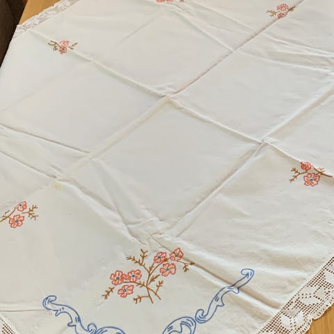 Håndbrodert, gammel lin-duk. 68 x 65 cm.