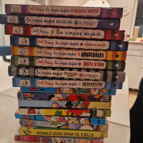 En god samling «En pingles dagbok». Noen godt brukt, noen knapt bladd i. Noen pocketer, noen hardback.