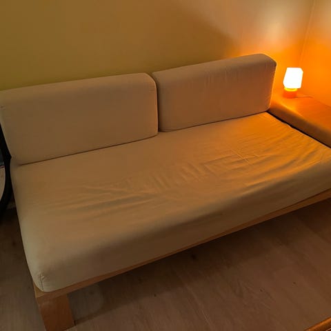 Godt, men pent brukt sovesofa. Stor plass til oppbevaring under sjeselongen. Lengden på sofaen er 230 cm. Gjøres om til sovesofa ved å trekke i en skuff. Som sovesofa blir liggedelen 200x140 cm.