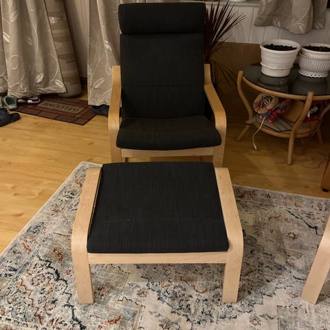 2 stykk pent brukte lenestoler med fotskammel. Noen flekker på trekk, som er vaskbart, samt noen bruksmerker på treverk. Har stått i en hytte og selges grunnet plassmangel og oppbevares nå i lager på Langhus.