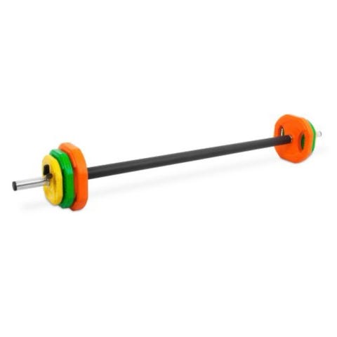 Vektstangsett som inkluderer en stang og flere vektskiver i fargene gul (1,25 kg), grønn (2,5 kg) og oransje (5 kg). Vektskivene har håndtak for enkel bruk og justering. Passer til styrketrening og generell vektløfting. Perfekt til hjemmebruk.