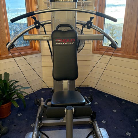 Multigym med over 100 øvelser. Stillegående styrketrening, uten vektskiver. Tar liten plass og er veldig enkel å bruke. Motstand opp til 110 kg - passer derfor til nybegynnere og de som trenger tyngre vekter.