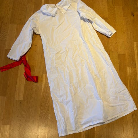 Hvit luciakjole ca str 122-128. Kjøpt på Nille og brukt to år. Litt misfarget helt nederst og mangler knapp i kragen, men ellers fin. 100 prosent bomull.