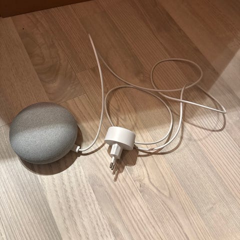 Google Home Mini smart høyttaler i svart farge. Kompakt design med tilhørende strømkabel. Egnet for stemmestyring og smarthusbruk. Original lader følger med
