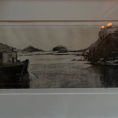 Innrammet i kraftig treramme som står godt til kunstverket. Ingen skader på ramme eller glass.