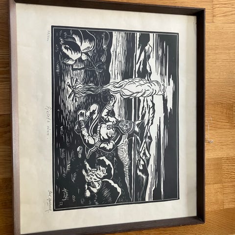 Tresnitt av Marit Bockelie inkl flott og kraftig treramme og glass. Total størrelse 75x55cm