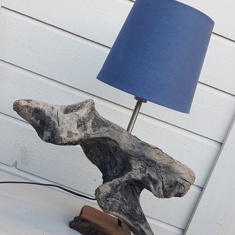 Veldig fin å dekorativ bordlampe laget av driv-ved selges