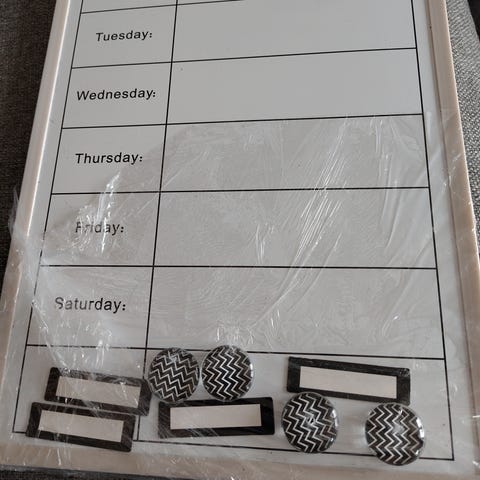 Selger magnetisk belønningstavle siden barna er blitt større. Har fungert fint. Mangler penner, men svamp følger med.