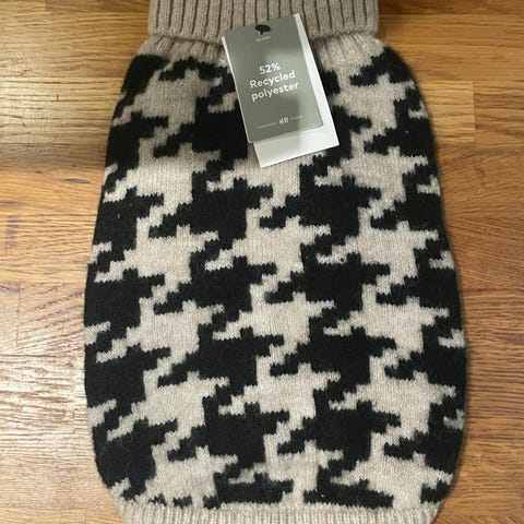 Fint genser i rosa med hvite mønstre og grå kanter. Genseren har åpninger for bena og er laget i mykt materiale. Passer for liten katt/ valp