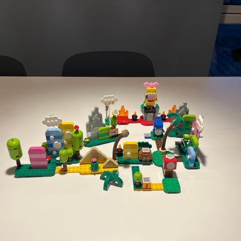 LEGO Super Mario byggeklosser med ulike deler og figurer. Inkluderer karakteren Mario med rød hatt og blå overall. Settet består av flere små komponenter i forskjellige farger og former, egnet for bygging og lek.