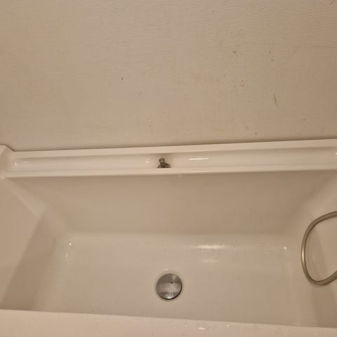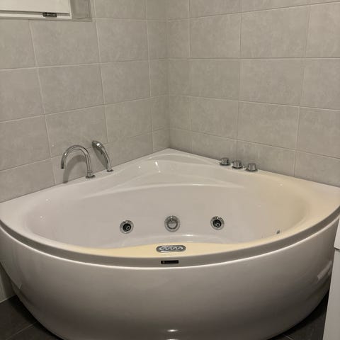 Victory badekar i hvit akryl med ergonomisk design, innebygd nakkestøtte og plass til en person.