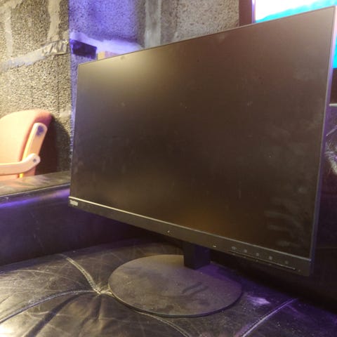 Lenovo 24 tommer skjerm med svart ramme og rund fot.