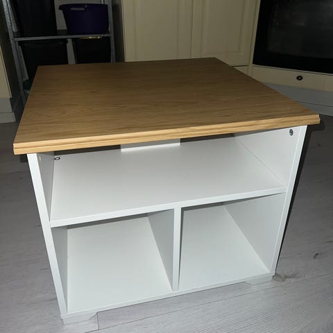 Praktisk skrivebord som kan dras ut (delen som kan dras ut er på hjul). Kan dras ut enten i vinkel som bildene viser, eller det kan dras ut så hele blir i en lengde. Så den kan brukes på flere forskjellige måter.