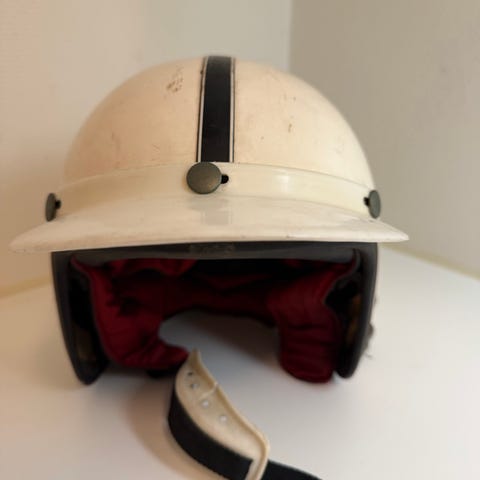 Stilig, gammel og velbrukt "Tommy" motorsykkelhjelm selges. For veteran-MC sjafførene der ut, så er dette et must! Hjelmen er hel, men den bærer definitivt preg av å være brukt. Størrelse vites ikke, men den er ikke veldig stor. Min mer moderne hjelm er en halvhjelm fra Biltema som er oppgitt som størrelse M, den gamle Tommyhjelmen er nok bittelitt trangere enn det.