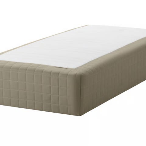Skårer rammemadrass fra Ikea i mørk beige med fast madrass. 10 års garanti og er inkludert bein i Eik. Beina har en høyde på 20 cm.