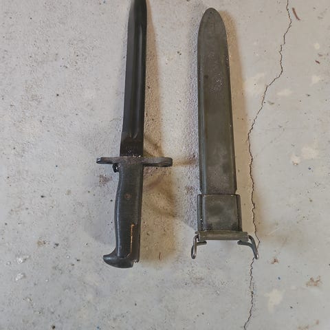 Militærkniv med metallslire. Kniven har en rett, spiss klinge med nummeret 8544 og bokstaven N preget på bladet. Håndtaket er svart og har tverrstang. Sliren er laget i metall og har en låsemekanisme for kniven.