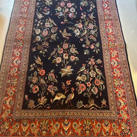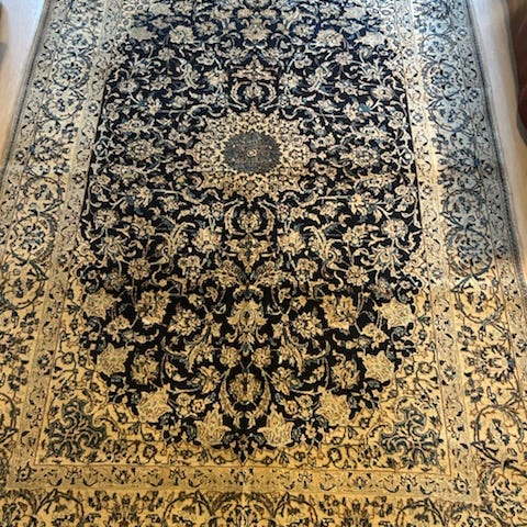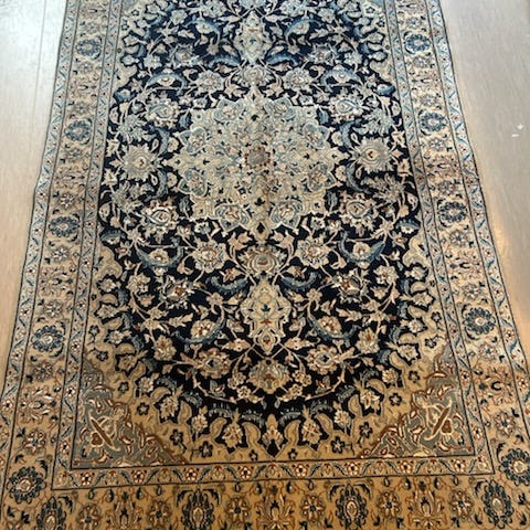Eksklusivt og elegant håndknyttet Nain-teppe i 9-la, kjent for sitt fine mønster, høye knutetetthet og svært gode kvalitet. Teppet er laget av ull med silkedetaljer, noe som gir et raffinert uttrykk og flott glans.