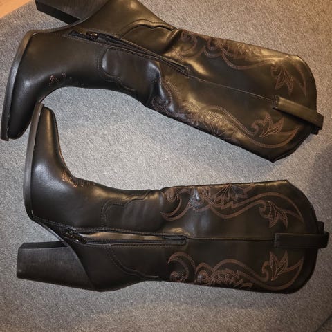 Støvletter i størrelse 38 laget av svart semsket skinn. Har høye hæler og solid såle med godt grep. Stilige, klassiske med høyt skaft.