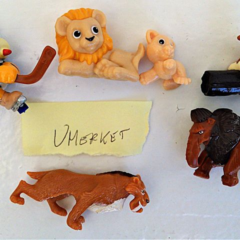 Samling på 6 figurer som forestiller løver med ulike tilbehør som hatt, paraply, musikkinstrumenter og klær. Figurene er små og laget i plastmateriale, egnet for samling eller lek.
