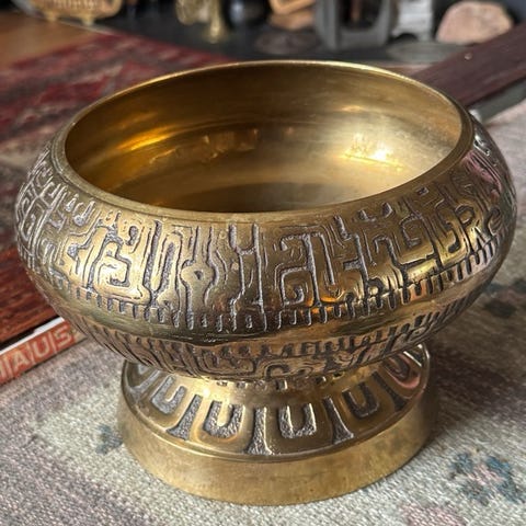 Kjøpt I India for snart 20år siden, antagelig laget i Nepal. Messing, men upusset på bildene.