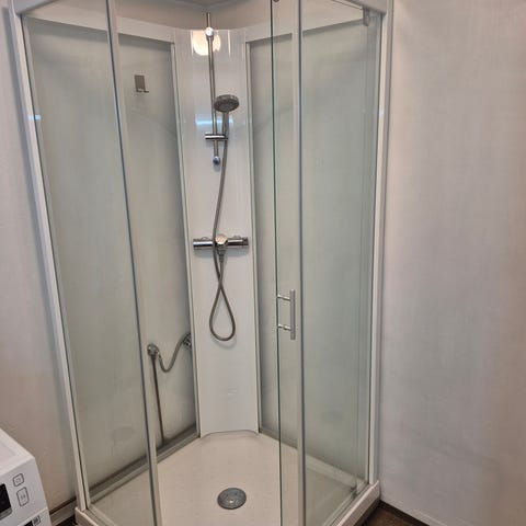 Selger tilsvarende Showerama dusjkabinett med skyvedører, Hvit profil og klart glass,Innebygd dusjpanel med termostatstyrt blandebatteri, hånddusj.Passer for baderom med begrenset plass, 90x70cm.