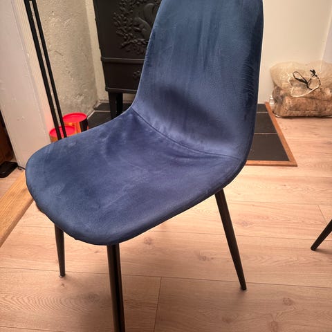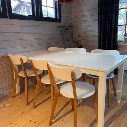 Fire flotte stoler fra Ikea. De er behagelige å sitte i. Stolene er i plast, med trefarget ben.