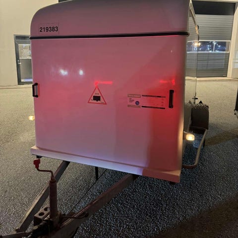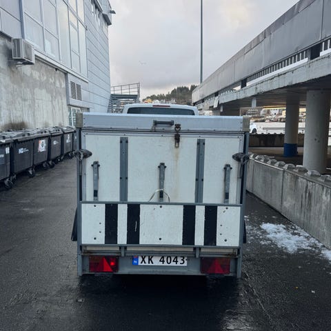 Tilhenger med dobbel aksling, hvite felger og grafisk dekor med motocross-tema. Tilhengeren har lukket kasse og bakdører for tilgang. Egnet for transport av utstyr og varer. Nye helårsdekk 2025. Nytt ledningsnettverk og lys 2025. Gode bremser.