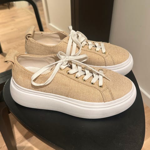 Zara sneakers joggesko i størrelse 40. Skoene har et mønstret design i beige toner og hvite lisser. Egnet for daglig bruk.