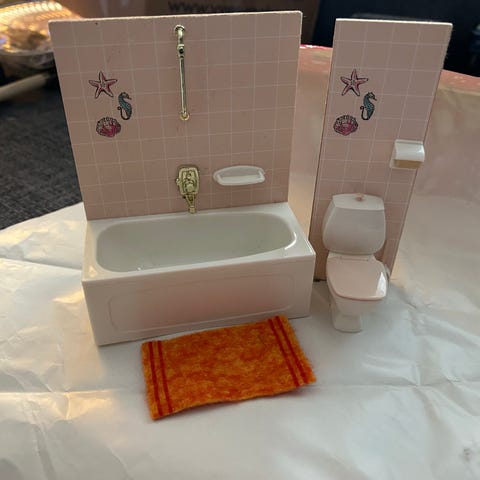 Nydelig retro sett med seng med rosa sengetøy. 2 Nattbord og et sminkebord. Passer til Lundby hus
