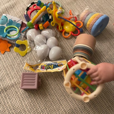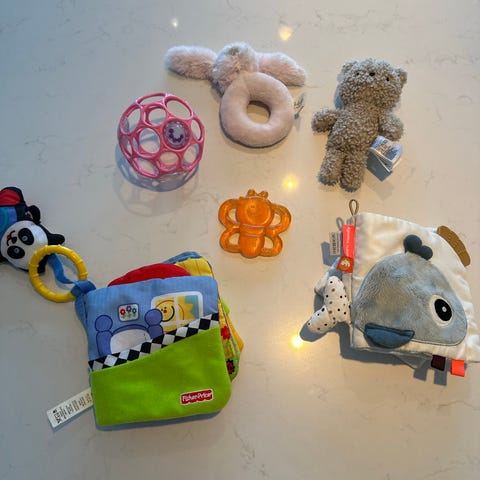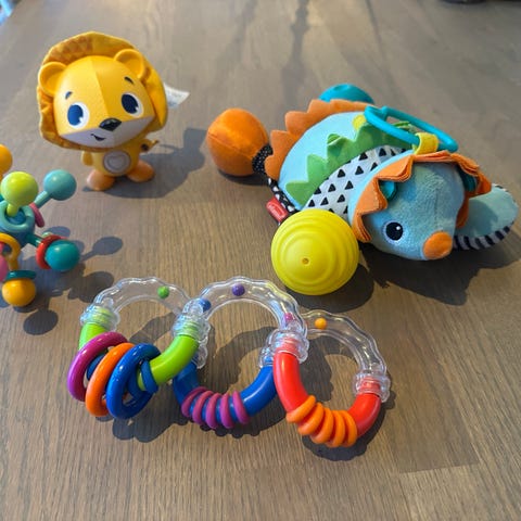 Diverse leker til baby, yngre barn. Puttekasse i tre, rangler, batteridrevet telefon med lyd og lys, kosekluter. Den ene er ikke brukt.