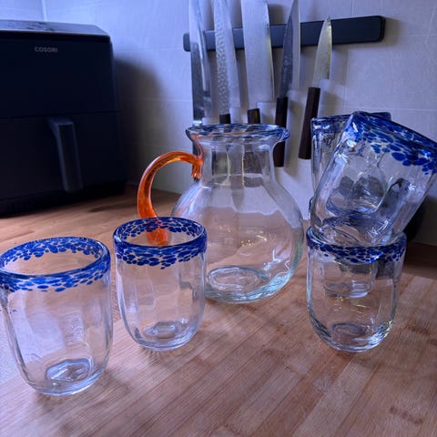 fire stykk hånd blåste glass med blått. Høyde 26,5 cm