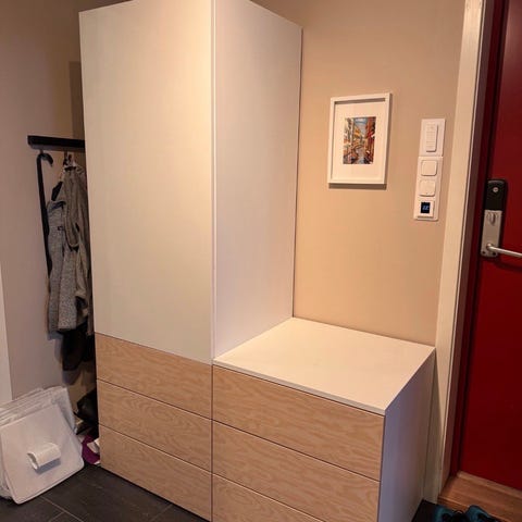 Pax garderobe bestående av skuffer og hylleplater. Pent brukt, se evt bilder for slitasjemerker. Her er en liste over innhold og nypriser.