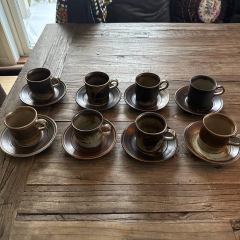 Porsgrund kaffekopper og fat i hvit porselen. Settet består av flere kopper med tilhørende fat, designet for servering av kaffe/te.Materialet er porselen, og fargen er hvit.
