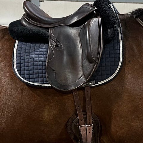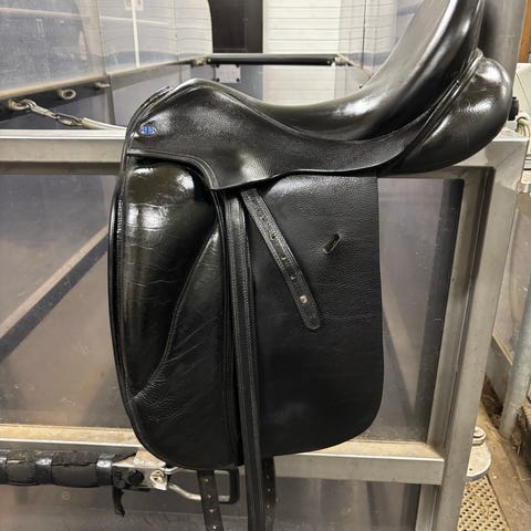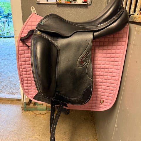 Prestige DX2 dressursal i svart kalveskinn. Salen har standard dressurdesign med polstrede knestøtter og stigbøylefester. Jevnlig fulgt opp av saltilpasser. Salen er 17 i setet, litt usikker på bredden i manken, men enkel å justere. Den har et bittelite sår i front (se bildet), men har ingenting å si for bruken. Dette er en dyr og fin sal, så tar ikke ansvar for å sende, men kan være behjelpelig med å møtes på Østlandet.