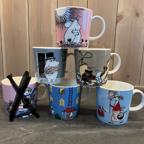 Arabia Mummi krus i 2-pakning med dekorative Mummi-motiver. Krusene er laget i keramikk og har fargerike illustrasjoner med karakterer fra Mummi-universet.