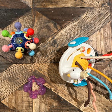 Masse fine babyleker selges samlet. Blant annet merker som Liewood, Sprell, Montesorri, giraffen Sophie.