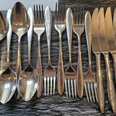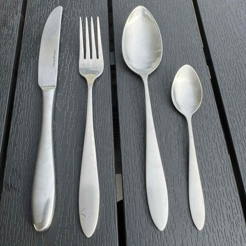 Hardanger Bestikk bestikksett bestående av 12 deler i rustfritt stål. Settet inkluderer forskjellige typer bestikk som kniver, gafler, skjeer og teskjeer, egnet for daglig bruk.