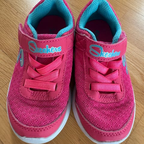 Skechers barnesko størrelse 23. Skoene har en kombinasjon av rød og svart farge med detaljer i gult og hvitt. Materialet er i tekstil og syntetisk med borrelås for enkel lukking. Sålen er laget av gummi.