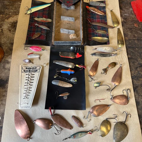 Sett med ulike fiskekroker og sluk i forskjellige modeller og størrelser. Inkluderer metallsluker med krok og spinnerblad, noen med fjærdetaljer. Leveres i en gul oppbevaringsboks. Passer til fiske i ferskvann og saltvann.