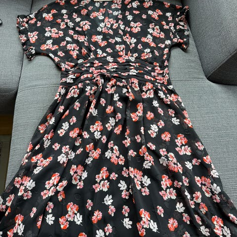 Blomstrete kjole, str.38, med snøring i livet (hele veien rundt) og 3 knapper i halsen. Og en knapp ved hvert håndledd. Behagelig å ha på.