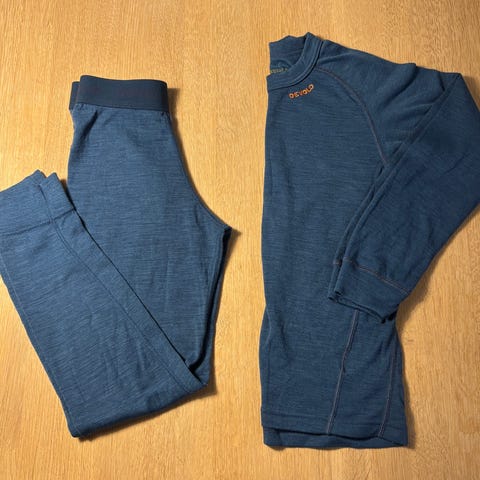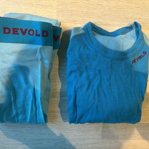 Devold Duo Active Junior shirt og longs i grønn farge, størrelse 140, laget av 80% merinoull. Plagget er designet for barn og er unisex. Merinoull gir god isolasjon og fukttransport, egnet som innerlag for aktiviteter i kaldt vær. Kløfri pga dobbelt lag.