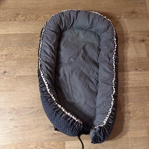 Babynestet er hjemmesydd på bestilling. Nydelig blåfarge i Velur🥰 Brukt av to barn, pris: 300kr