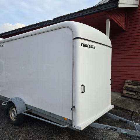 Brenderup lukket tilhenger med dobbel aksling, hvit farge og solid konstruksjon. Egnet for transport av varer som krever beskyttelse mot vær og vind. Tilhengeren har bakdør/rampe for enkel lasting og lossing.