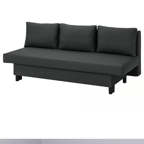 IKEA sovesofa i grå stoff med oppbevaringsplass under setet. Sovesofaen har tre ryggputer og kan omgjøres til en seng. Sofaen har hjul under sovefunksjonen for enkel omforming.