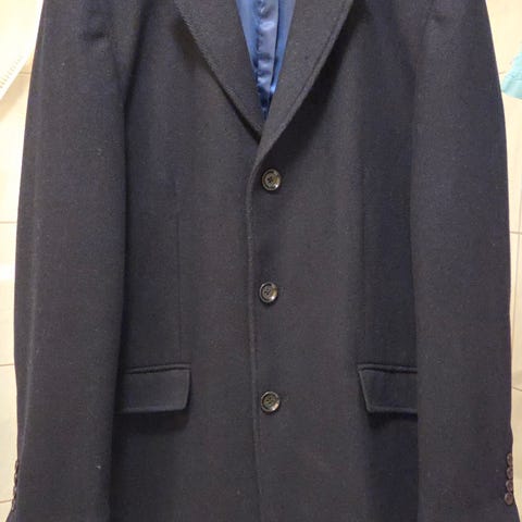 Dressmann frakk i størrelse 54 r, laget av ullmateriale. Kåpen har en grå farge og er designet for menn. Den har en klassisk knappelukking og to lommer foran. Innsiden er foret med glatt materiale.